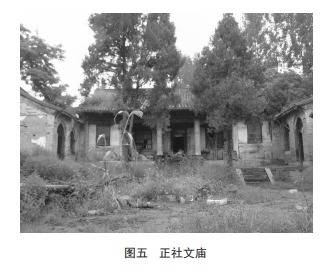 正社文庙(图五)位于长治市黎城县上遥镇正社村,是2007年黎城县级文物保护单位,也是八路军129师随营学校旧址。正社文庙中现存的清嘉庆八年(1803年《重修文庙序》记载∶"黎邑西二十里许有村名正社,是村之建,由来久矣…·东晋时,士励名节,俗尚儒雅,缙绅之士于太和元年建立大成至圣文宣王殿于村之北,五间七檩而两廊不备焉。迨其后,世远年湮,屡遭兵燹,而斯庙竞湮没无存矣。至大清顺治十五年,父老不忍古迹之磨灭而复立庙一间,示不忘也。康熙四年重修为三间,而增廊房十间。乾隆五年重修为五间,又增歌楼三间。"I4现文庙内部荒败,无人打理。庙门内为戏楼,东西两庑一侧已坏,皆需修缮。正殿面阔五间,内有孔子挂像及香案,殿内环境有待整理,殿外两侧有配殿。庙内发现石碑三通,其中两通嵌于大殿墙体,另一通残碑则被置于荒草之中。